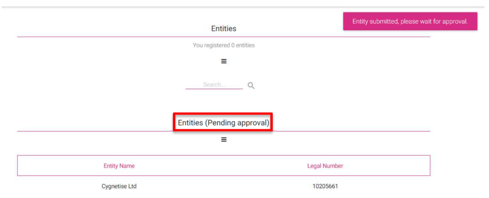 When Cygnetise has approved the entity it will move out of Pending Approval and into the Entities section.